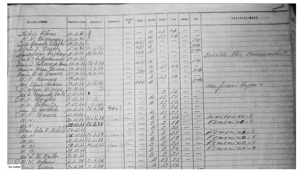 Las exhumaciones realizadas por el Equipo Argentino de Antropología Forense que permitieron la identificación genética de las víctimas también hicieron visibles las marcas que los vuelos de la muerte dejaron en los cuerpos: huesos fracturados en varias partes, lesiones múltiples y severas cuyo mecanismo de producción era compatible con un choque o golpe contra un objeto o superficie dura.