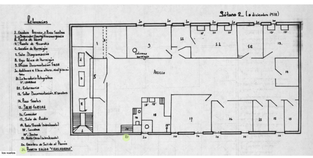 Aproximadamente a las 17:00 hrs, en Capucha se comenzaba a llamar a los detenidos por número de caso. Se los formaba en fila india tomados uno del otro por los hombros, ya que iban encapuchados y grilletes. Los bajaban de a uno. Sentíamos el ruido que hacían los grilletes al caminar acercándose a la puerta, que se abría e inmediatamente se volvía a cerrar. Cada uno llevaba consigo sólo la ropa que tenía puesta. Eran llevados a la enfermería del sótano, donde los esperaba el enfermero que les aplicaba una inyección para adormecerlos, pero que no los mataba. Así vivos, eran sacados por la puerta lateral del sótano e introducidos en un camión. Bastante adormecidos eran llevados a Aeroparque, introducidos en un avión que volaba hacía el sur, mar adentro, donde eran tirados vivos. Muchas veces durante el traslado se escuchaba sobrevolar helicópteros por la zona. Por ello suponemos que a veces los traslados se hacían por este medio. […] De los miles de detenidos que se fueron en estos traslados colectivos nunca supimos más. Muchas veces encontramos la vestimenta que tenían los compañeros el día del traslado en una piecita -el Pañol- […].