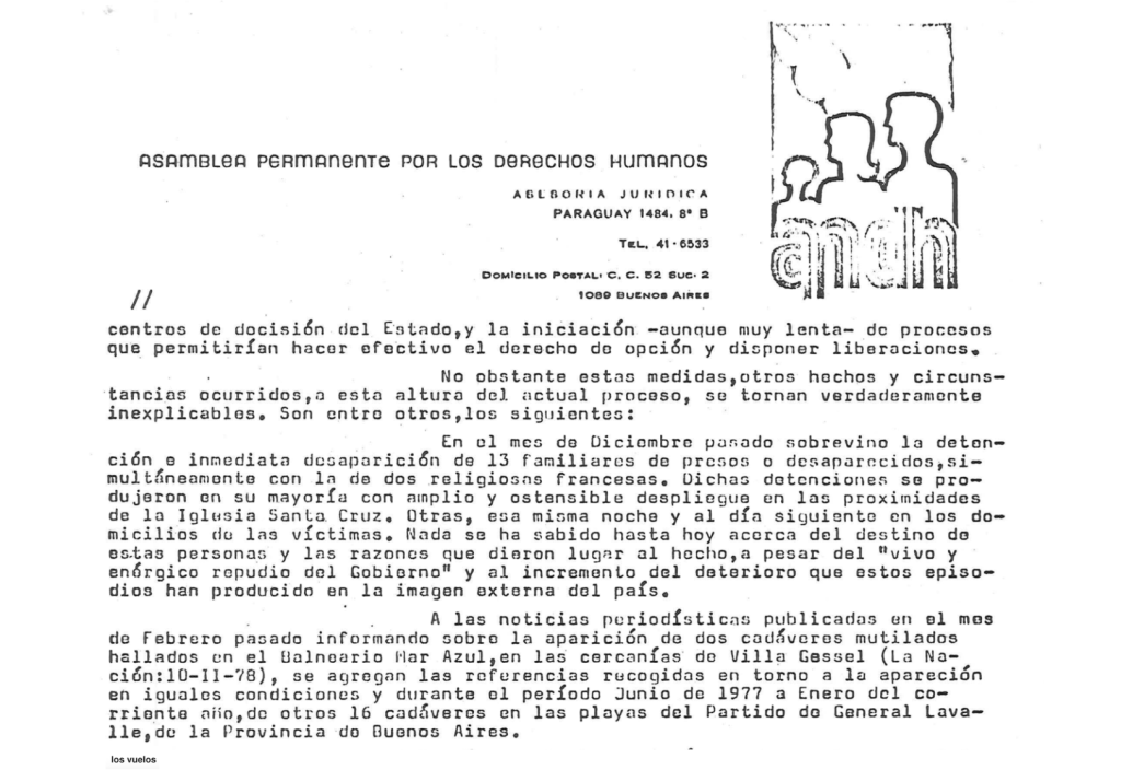 Tenemos sobrados motivos para pensar que entre estas víctimas pueden estar nuestros hijos o los de varios miles de padres cuyos nombres y datos poseemos. Constituye un elemental deber de humanidad, justicia y honestidad, llevar adelante la investigación, cualesquiera fuesen sus consecuencias y exhumar los cadáveres para permitirnos hacerlos examinar y contribuir a su identificación. Se trata, evidentemente, de asesinatos en masa, cometidos con toda impunidad y por elementos que dispusieron de barcos o aviones como para arrojarlos al mar, hecho que, por otra parte, se comenta habitualmente en la zona de las playas8.