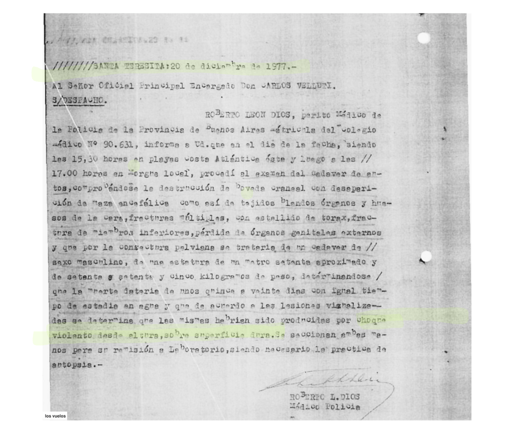 A los cadáveres que se recogían de las playas –que no podemos saber si fueron todos los aparecidos, o solo una parte– se les practicaban autopsias. A fines de diciembre de 1977, los procedimientos médico legales asentaron que el grupo encontrado estaba compuesto por cuatro mujeres y un varón; el tiempo demostraría que esa suposición no era del todo correcta. Las autopsias atribuyeron la muerte al “choque violento desde altura sobre superficie dura”2 o a “fracturas múltiples”3.