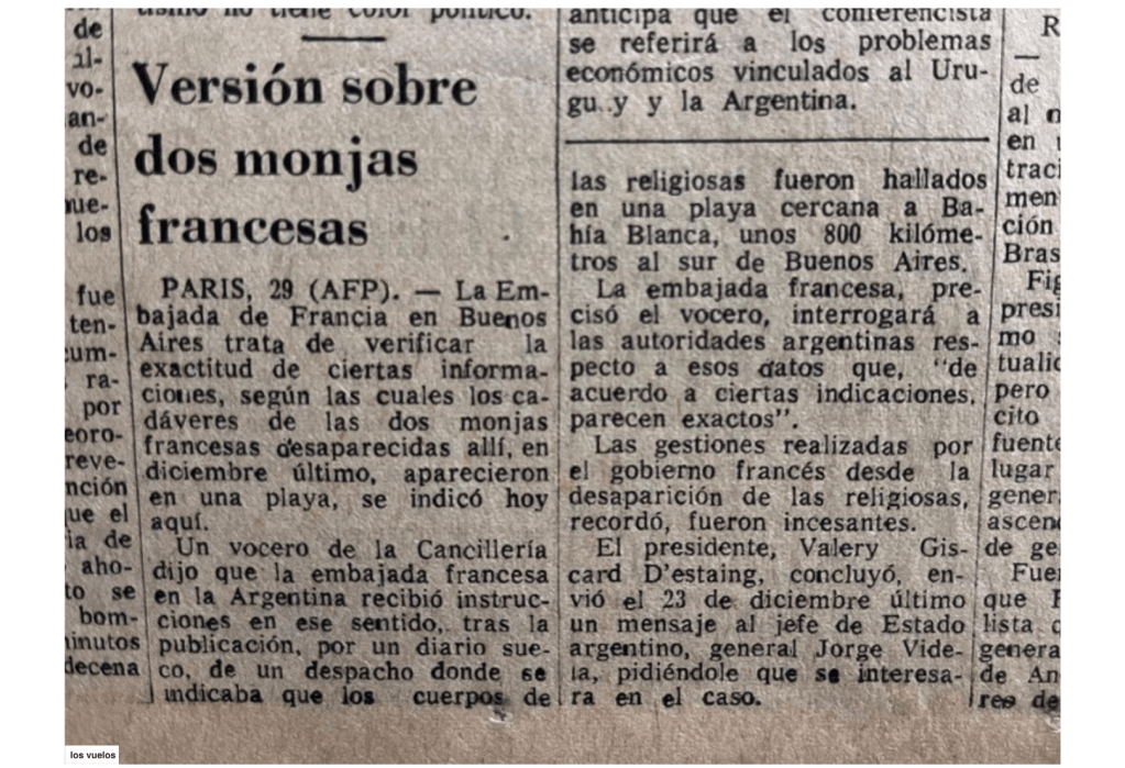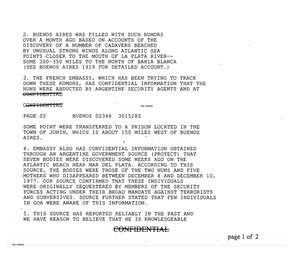 A fin de ese mismo mes, el 30 de marzo de 1978, otro cable titulado “Informe sobre muerte de monjas” relató que tenían información “obtenida de una fuente del gobierno (protegida) que siete cuerpos fueron descubiertos algunas semanas atrás en las playas del Atlántico cercanas a Mar del Plata. De acuerdo con esta fuente, los cuerpos pertenecen a las dos monjas francesas y a cinco madres quienes desaparecieron entre el 8 y el 10 de diciembre de 1977”6. Esta versión, también fue difundida por los medios gráficos de circulación nacional.