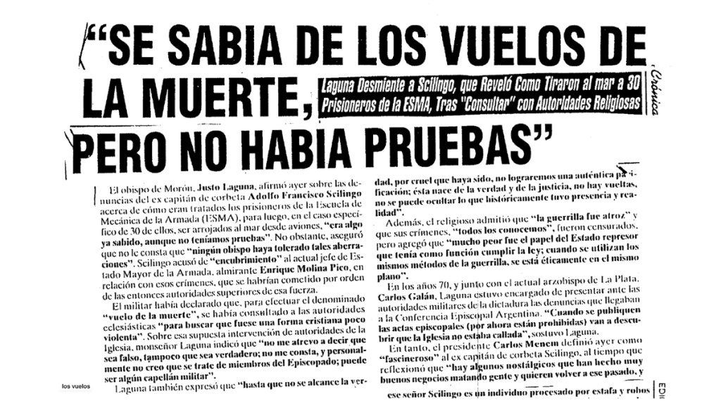 - Crónica, “Se sabía de los vuelos de la muerte, pero no había pruebas”, 4/03/1995. ↩︎